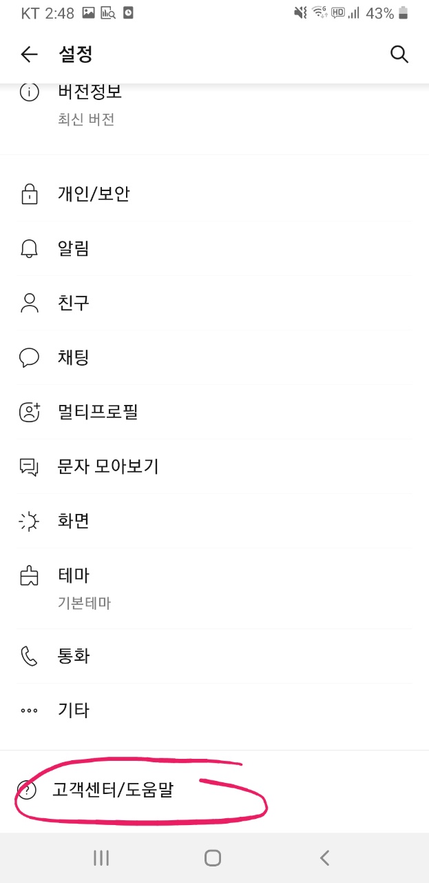 모바일 카카오톡 우측 상단 톱니바퀴 클릭해서 전제 설정 클릭 후