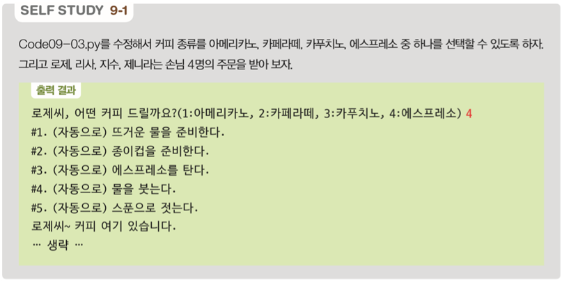 coffee = int(input("소진씨, 어떤 커피 드릴까요?(1:아메리카노/2:카페라떼/3:카푸치노/4:에스프레소) "))