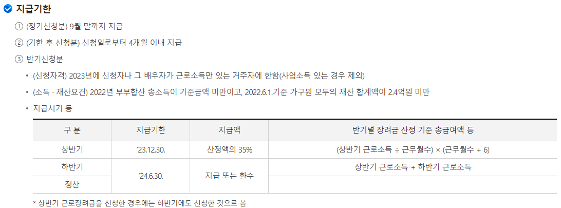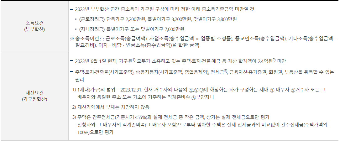 신청 자격은 가구원 수, 연간 소득액, 재산 기준에 따라 달라집니다. 대체로 저소득 근로 가구를 대상으로 하며, 구체적인 기준은 매년 변동될 수 있습니다.