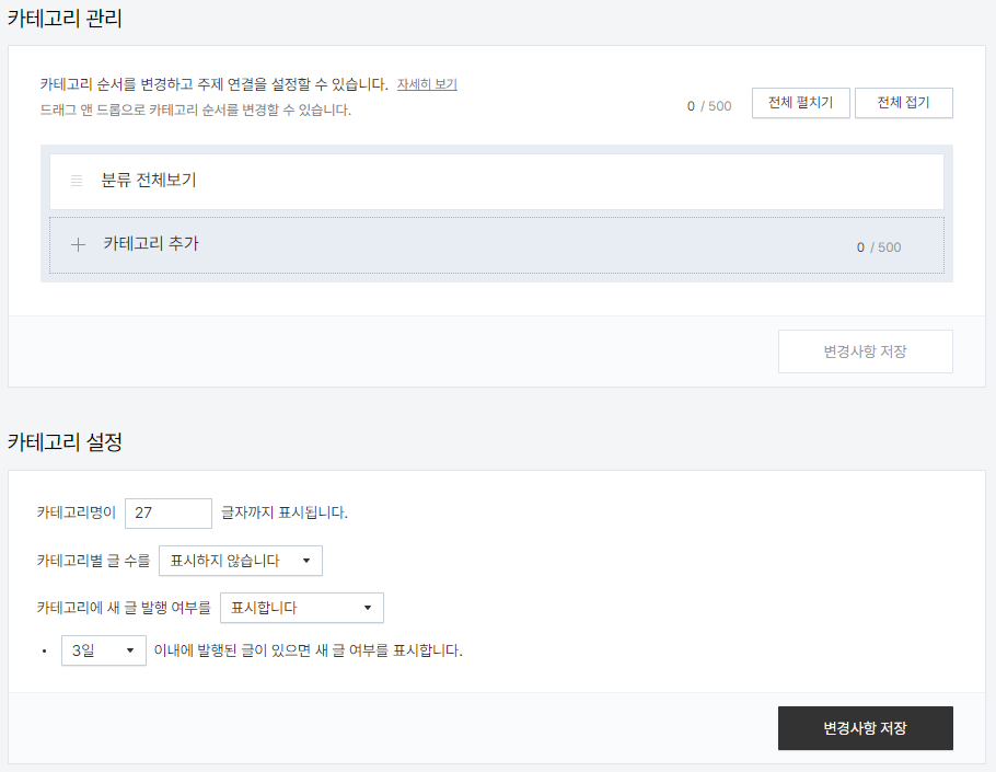 하단에 있는 카테고리 설정은 큰 의미는 없으나 저 같은 경우 처음 들어온 방문자가 볼 때 글이 없어 보이는 걸 들키기 싫어 카테고리별 글 수를 표시하지 않습니다.