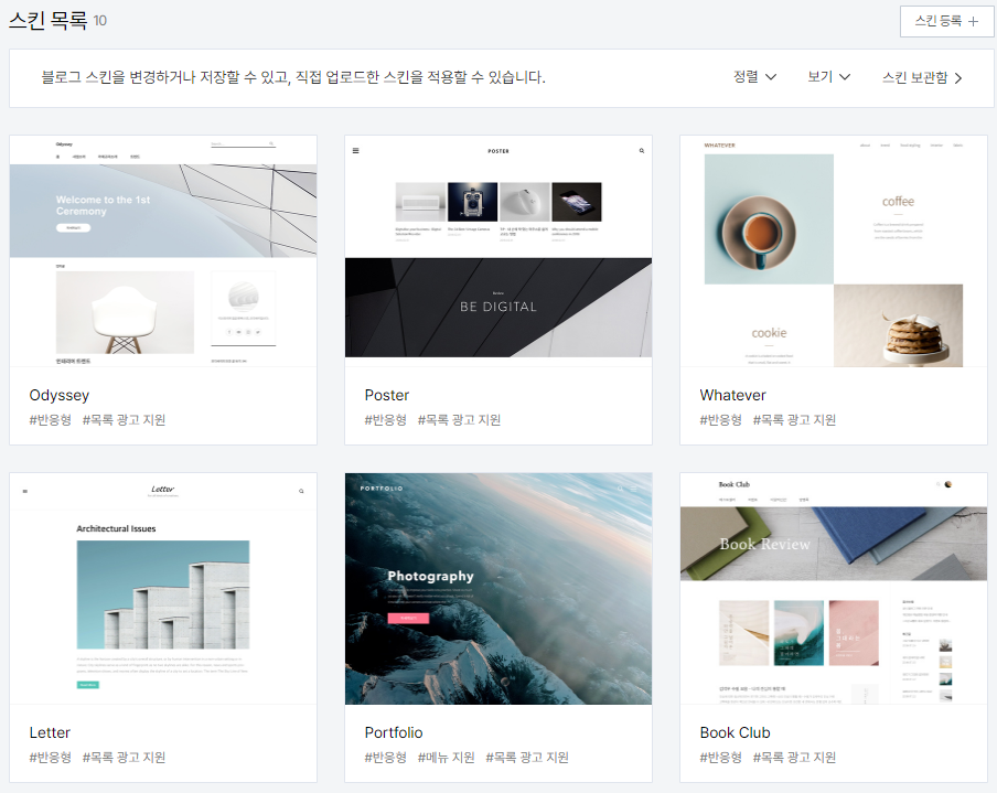 속도도 크게 차이는 없으나 개인적으로 기본 스킨 중 추천드리자면 Poster, Book Club 긴 한데 이건 어디까지나 개인 취향입니다.