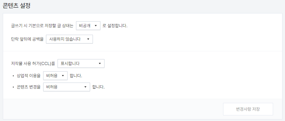 - 글쓰기 시 기본으로 저장할 글 상태는 '비공개'로 설정 합니다.