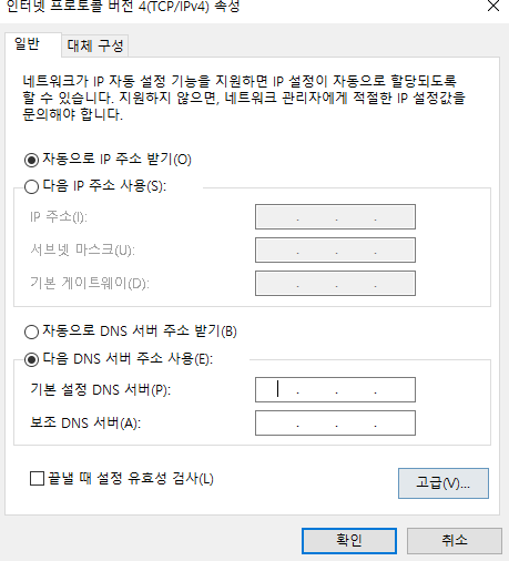 - "다음 DNS서버 주소사용"을 선택하고 원하는 DNS 서버 주소를 입력합니다.